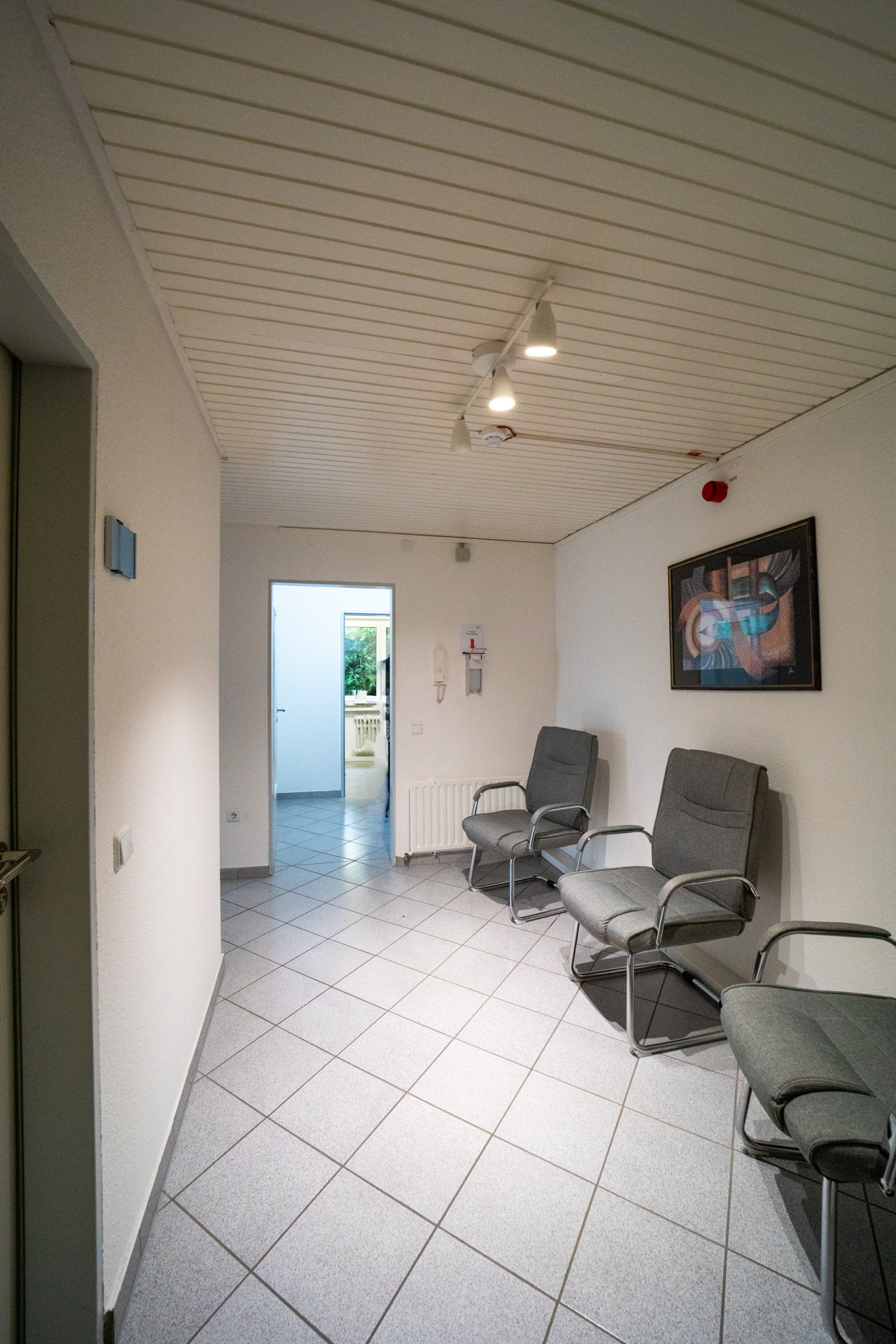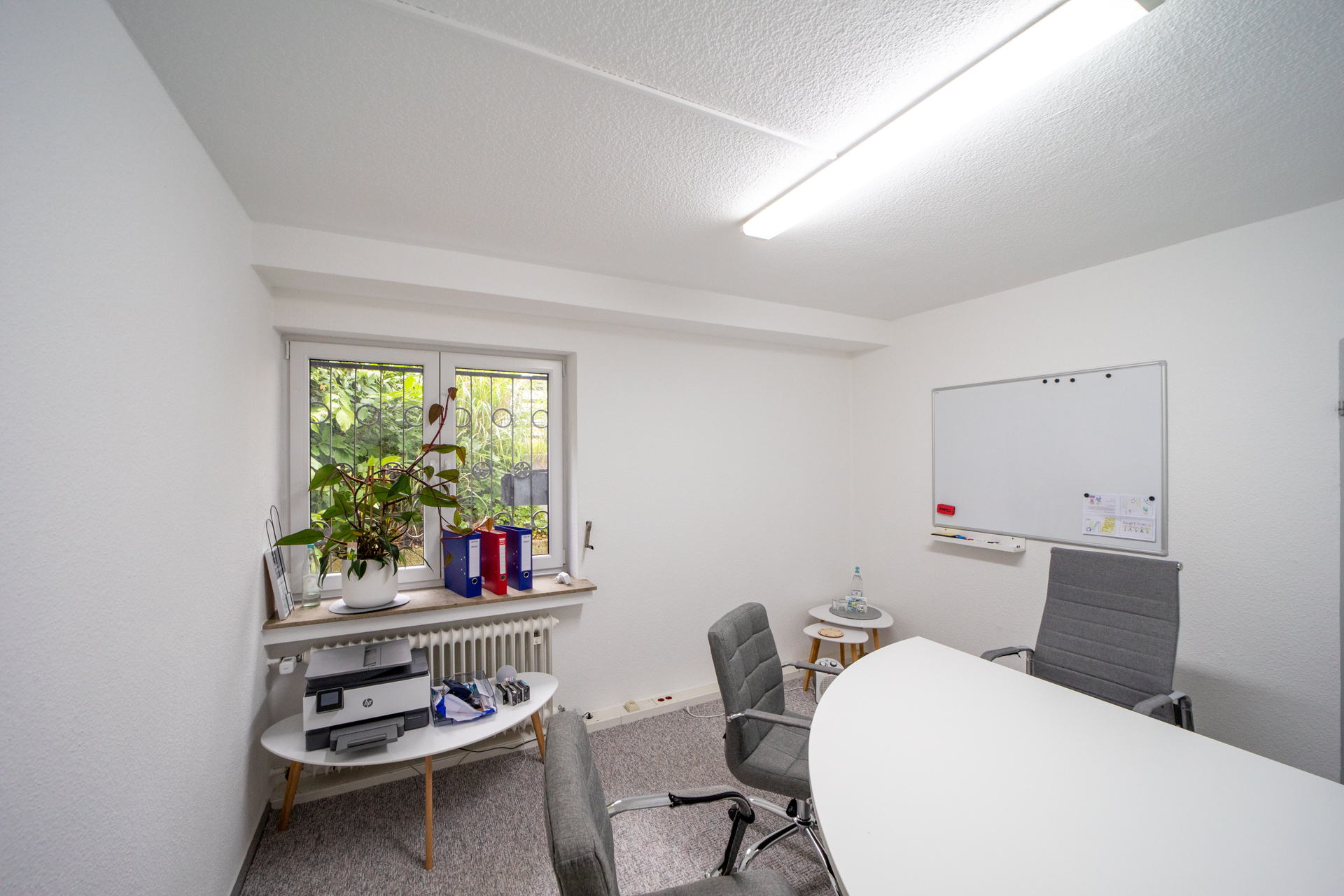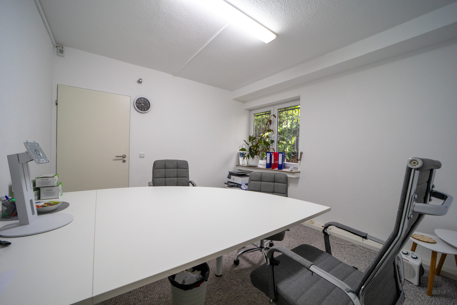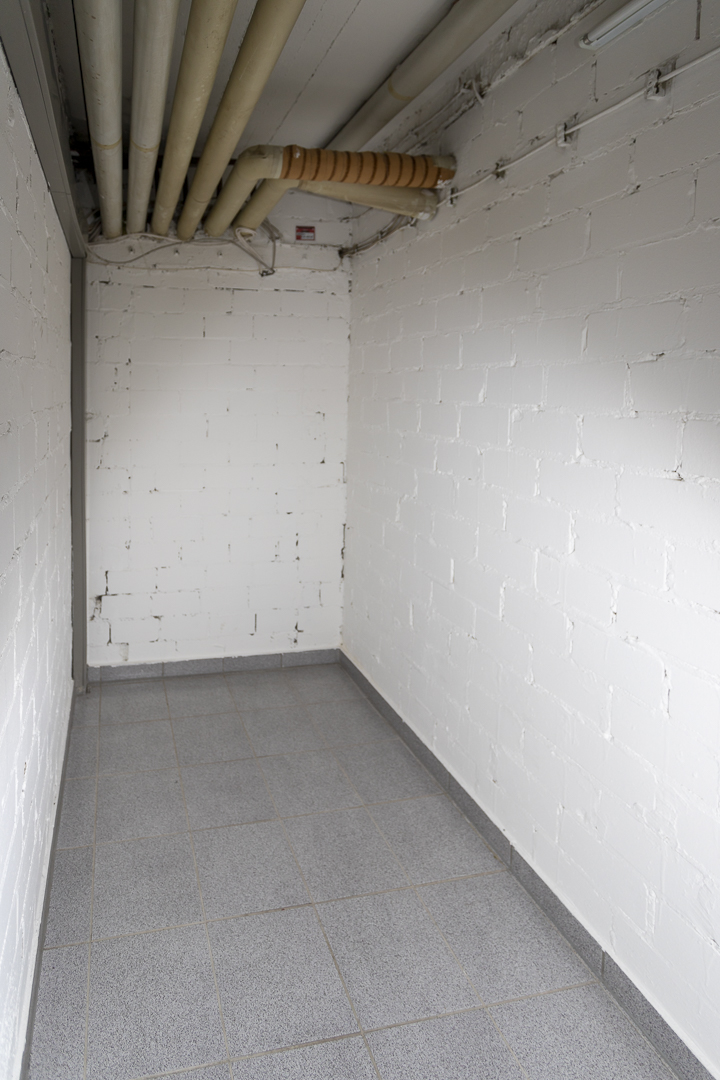 Der Büroraum ist weiß gestrichen und verfügt über einen grauen Teppichboden. An den Büroraum grenzen zwei hintereinander liegende Lagerräume, in denen Fliesen verlegt sind.