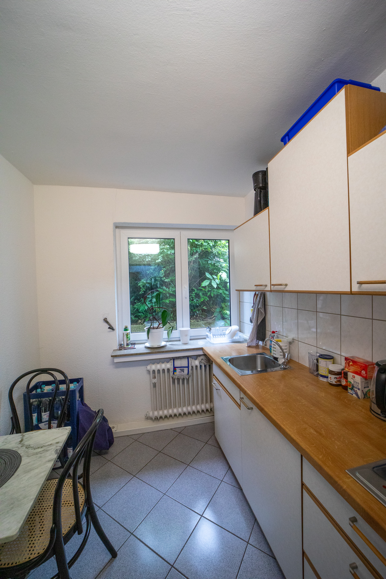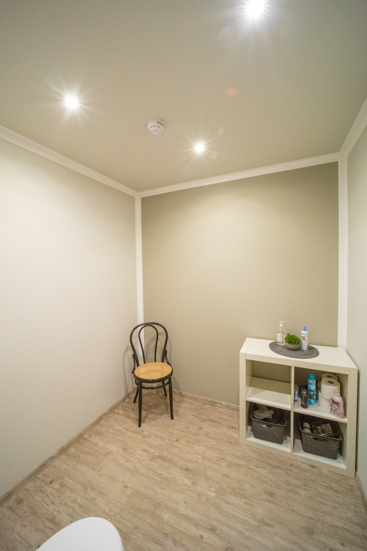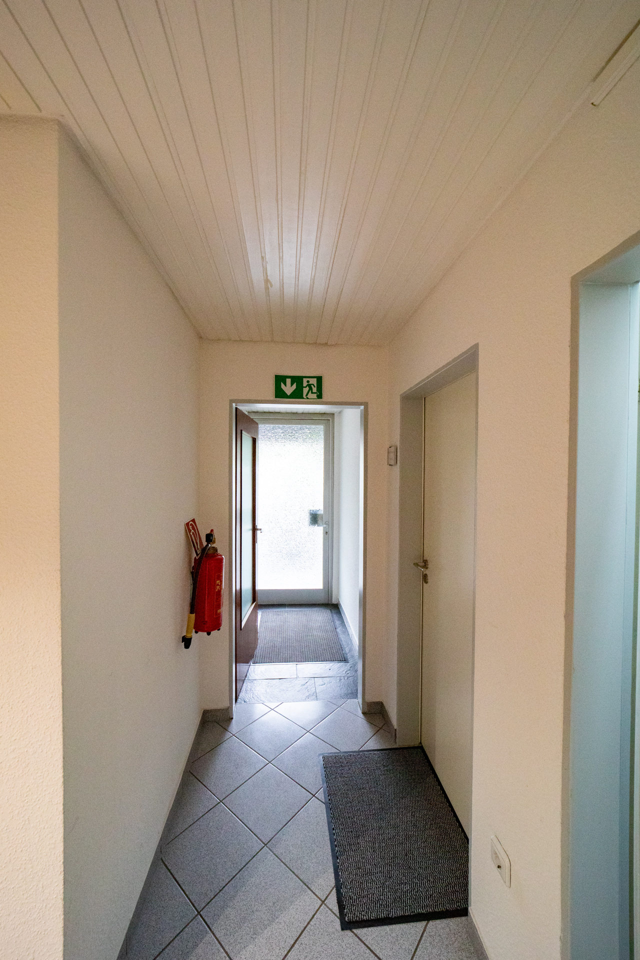 Der Büroraum ist weiß gestrichen und verfügt über einen grauen Teppichboden. An den Büroraum grenzen zwei hintereinander liegende Lagerräume, in denen Fliesen verlegt sind.